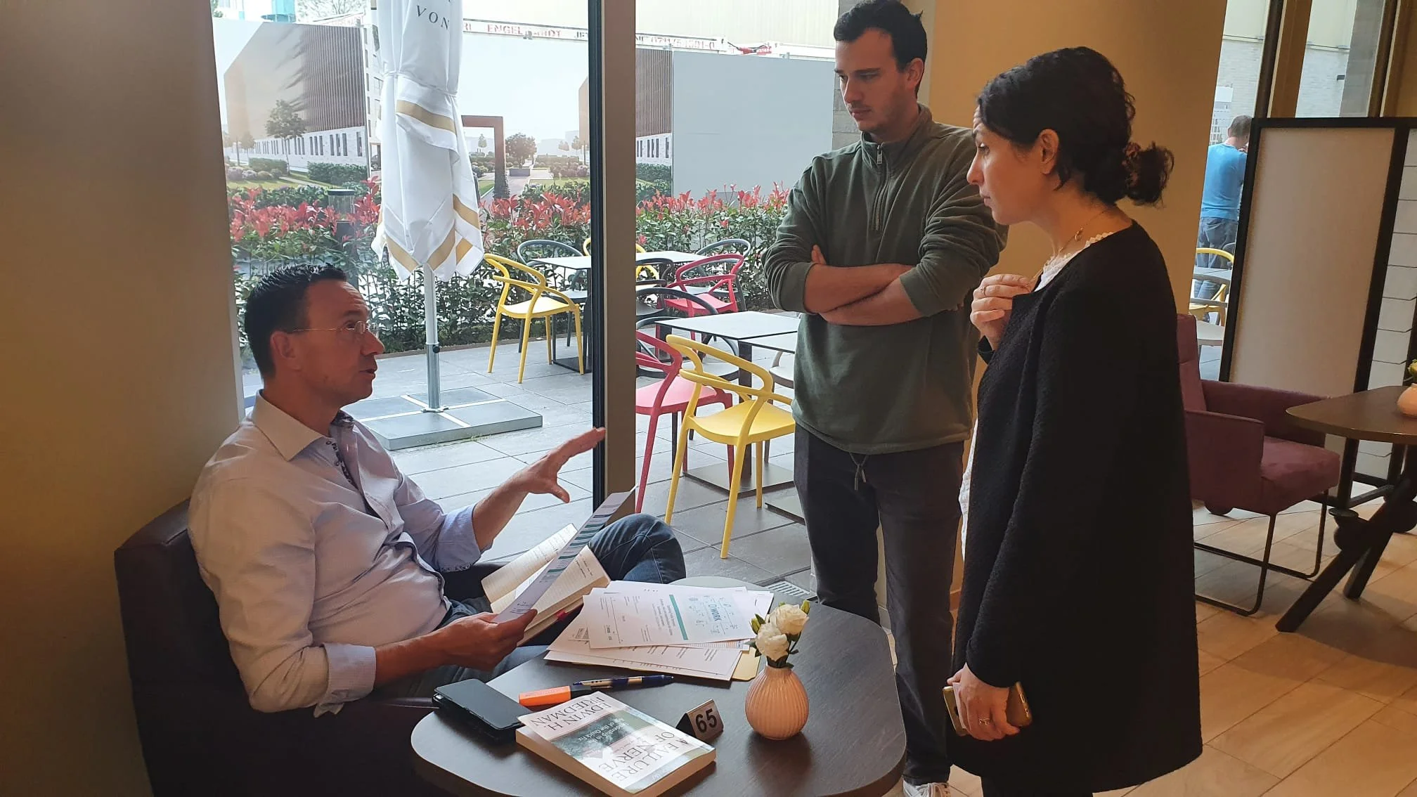 2. Back at the hotel going over last-minute changes to the program and a myriad of details with project officer Marcella Migliori and communications officer Tilemachos Dafnis from CESI. Such as a speaker that couldn't make it because of a strike and another that got cold feet just 2 hours before the start of the event and wanted to pull out. After providing some clarification and reassurance, all was well again and the speaker was great! Working with people with an eye for detail and interpersonal sensitivities as these two have, is key when organising an event.